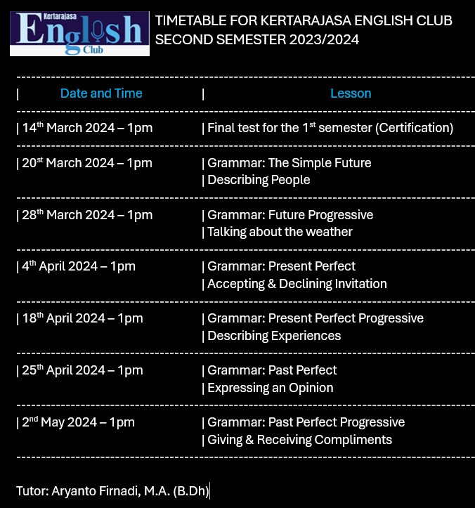 (Kamis, 15 Mei 2024) Keratarajasa English Club (KEC) adalah salah satu Unit Kegiatan Mahasiswa pada Sekolah Tinggi Agama Buddha (STAB) Kertarajasa yang bertujuan untuk meningkatkan keterampilan Bahasa Inggris Mahasiswa Program Studi Pendidikan Keagamaan Buddha (PKB). UKM ini menjadi salah satu wadah bagi mahasiswa untuk belajar berkomunikasi menggunakan Bahasa Inggris. Pada semester yang lalu, Aryanto Firnadi mengaktifkan kembali UKM yang sempat mandek ini dengan mewajibkan seluruh mahasiswa baru untuk bergabung di dalam KEC.